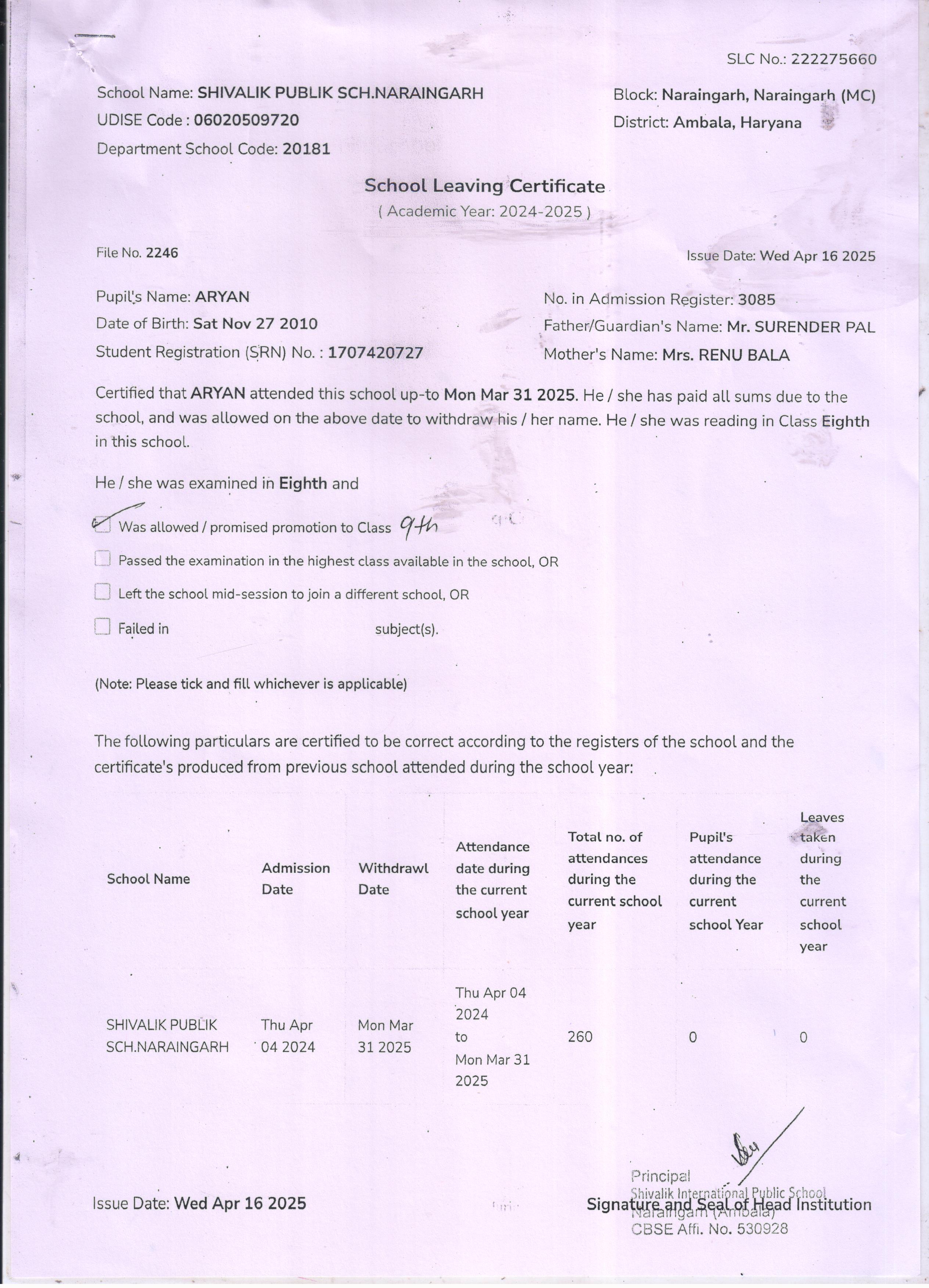 1 3085 ARYAN SURENDER PAL 2024-25 Attachment