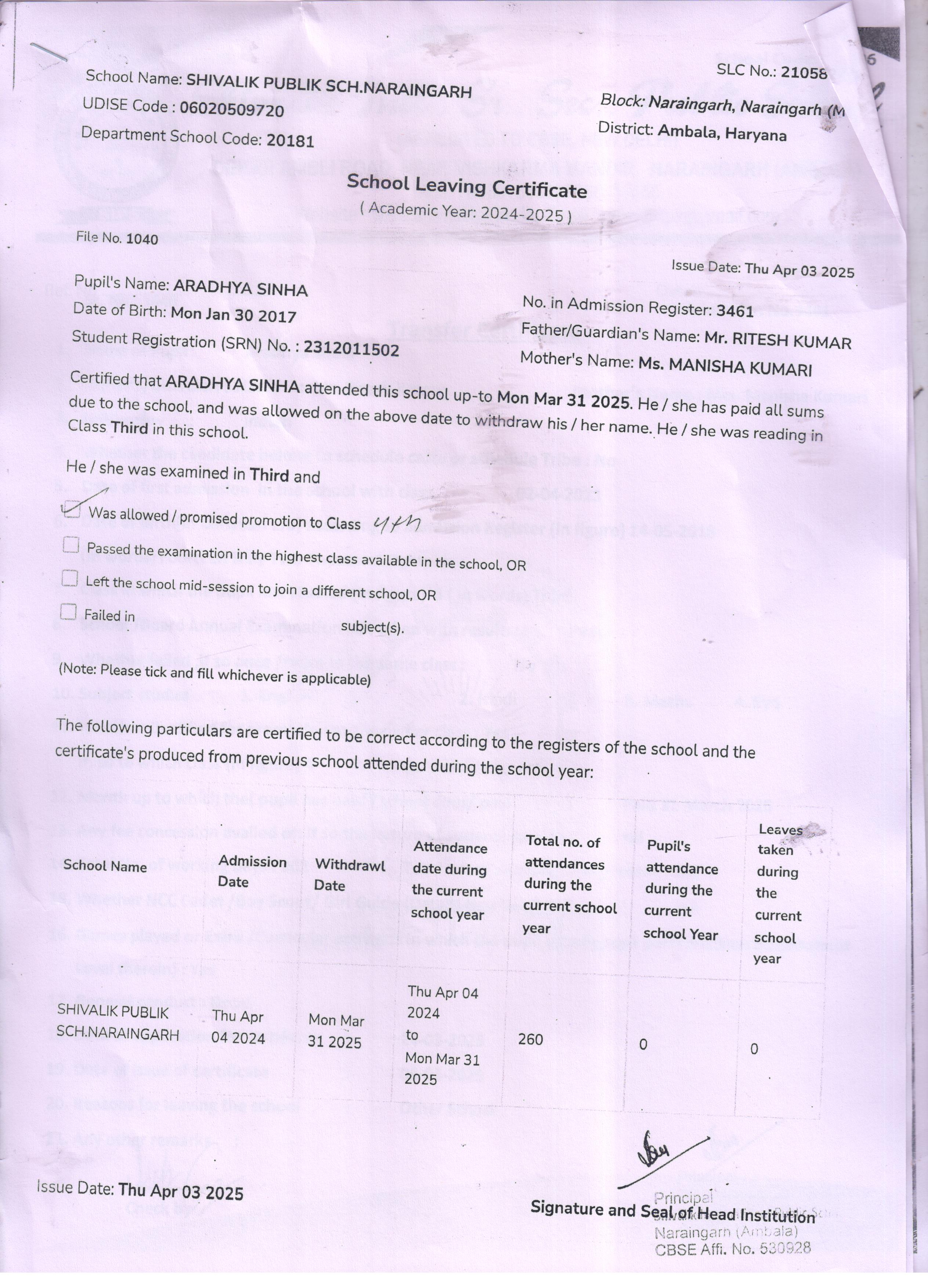 27 3461 ARADHYA SINHA RITESH KUMAR 2024-25 Attachment