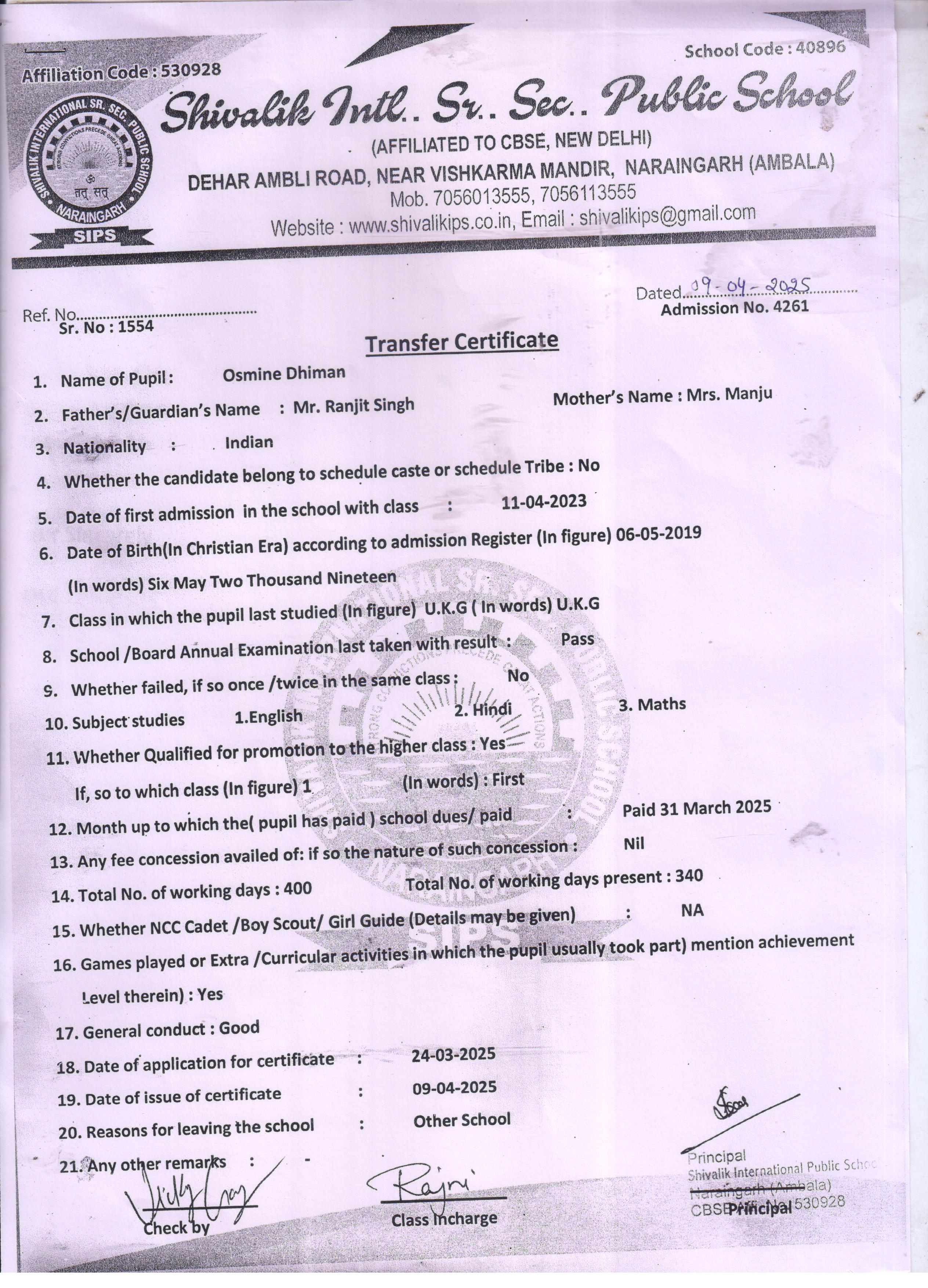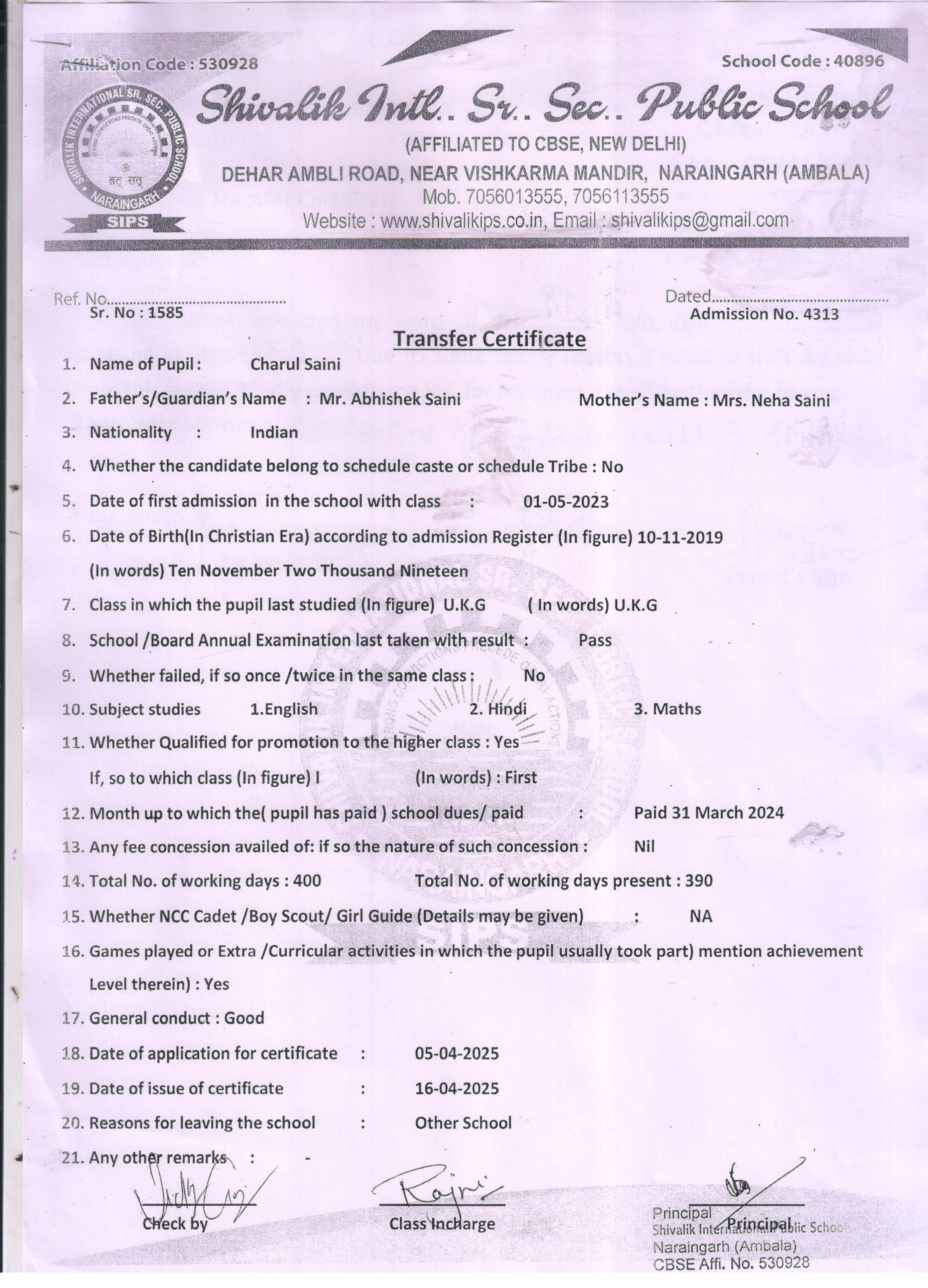 61 311 RANVIR SAINI DHARMAVEER 2024-25 Attachment