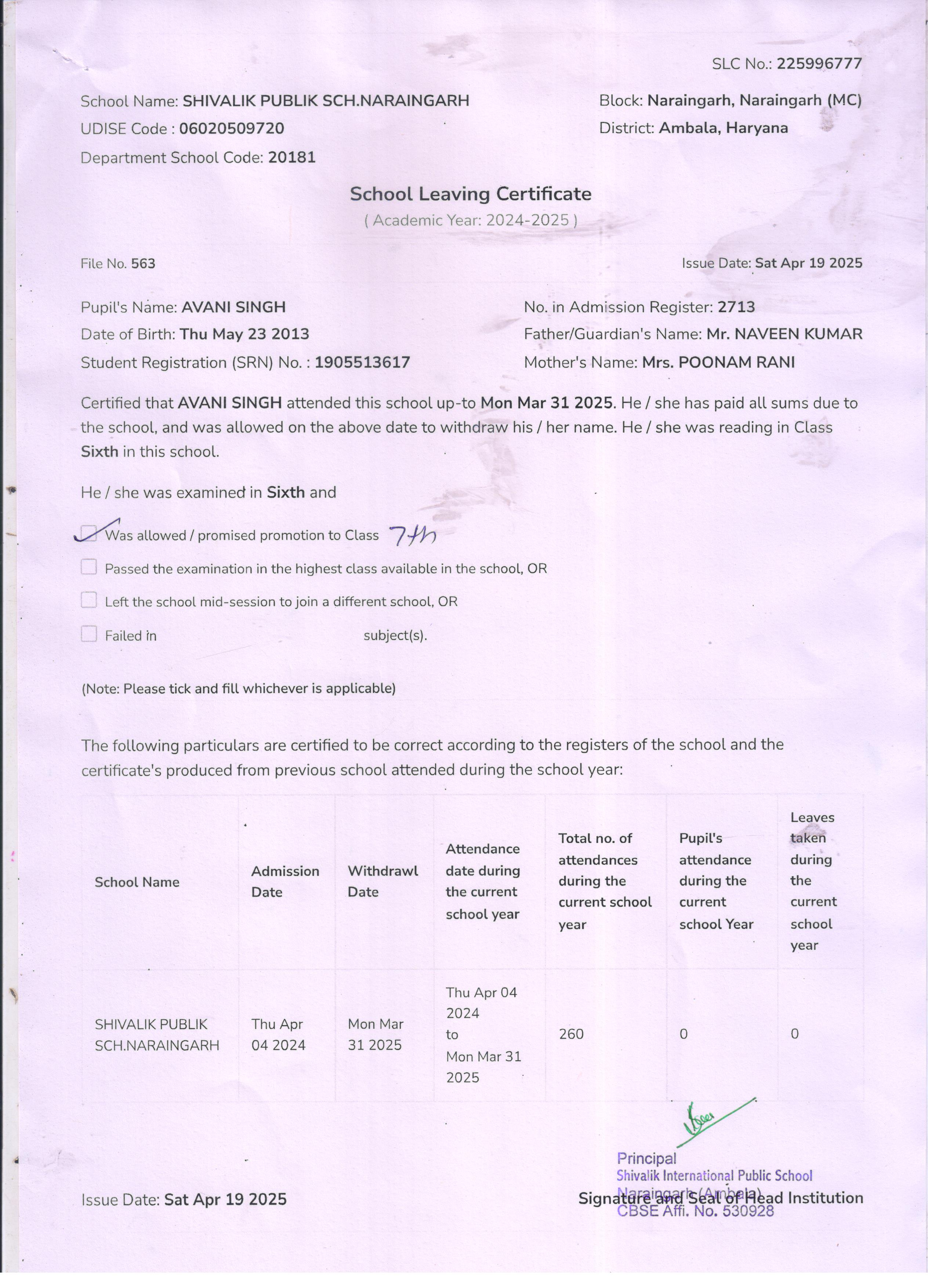 91 271 AVANI SINGH NAVEEN KUMAR 2024-25 Attachment
